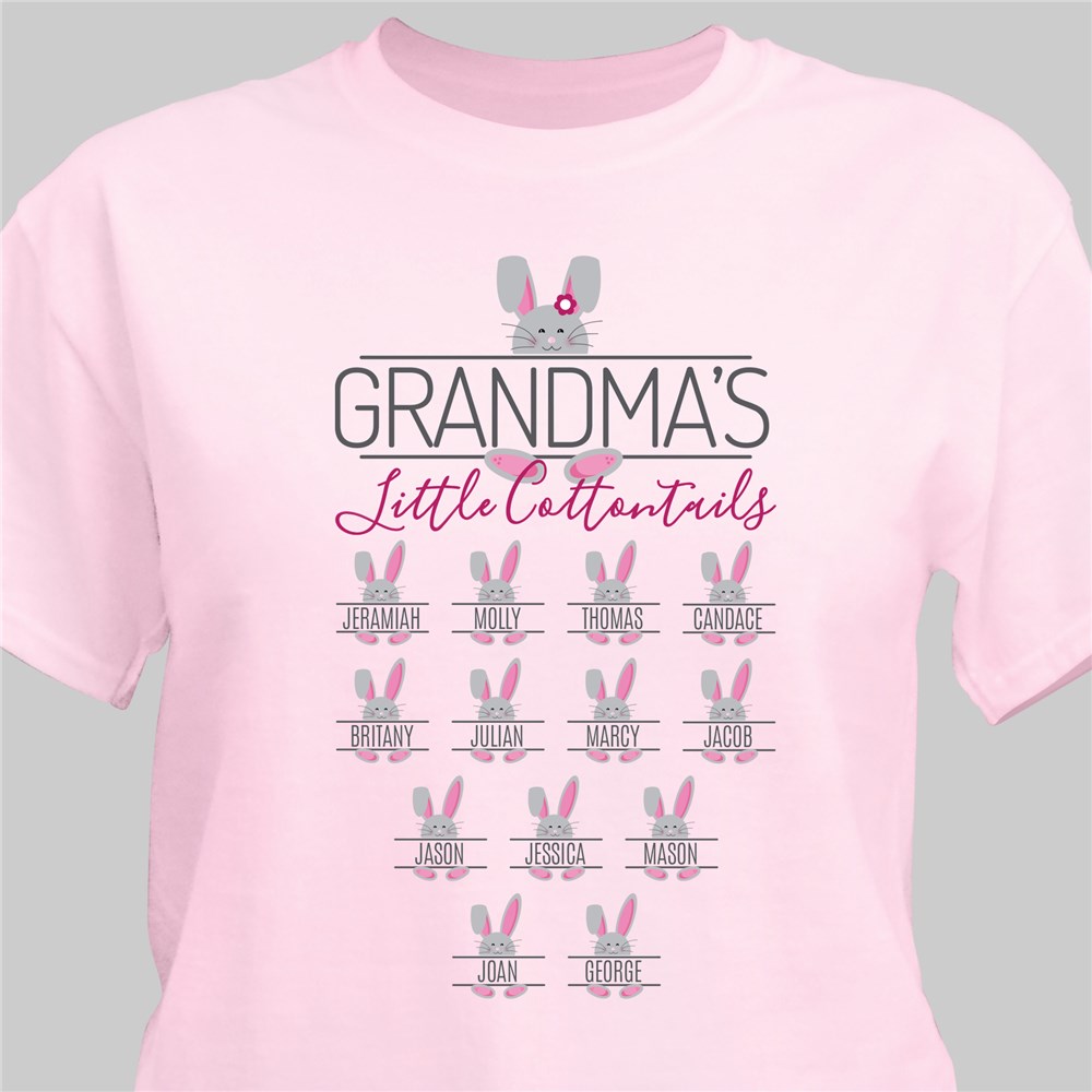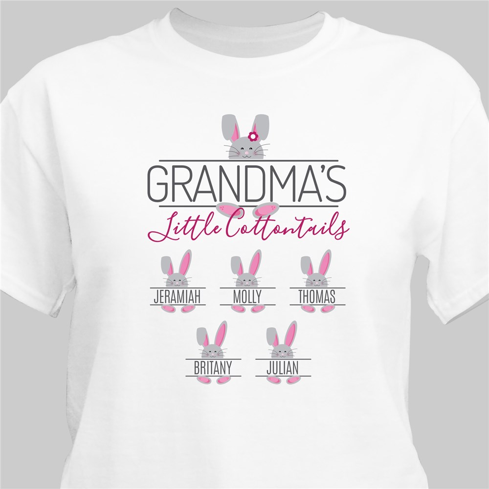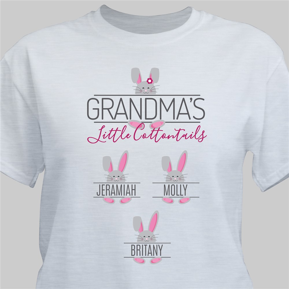 Show off your little cottontails in our Personalized Little Cottontails T-Shirt! This t-shirt is not just for Grandma, personalize this t-shirt with any title and up to 16 names on your choice of t-shirt color.< You don't have to hunt any further, this t-shirt is perfect for Easter!
