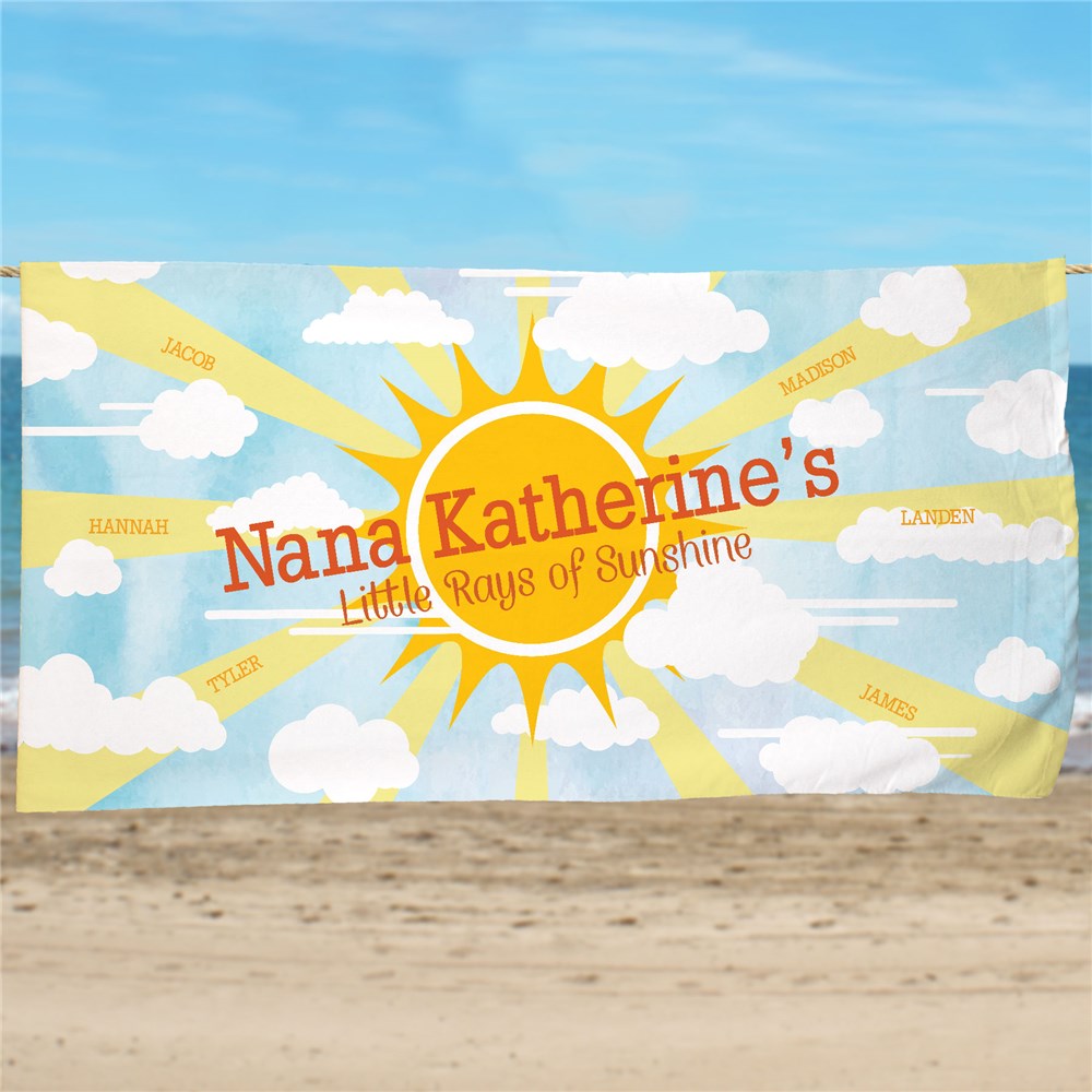 Gift Mom or Grandma a fun gift she can use by the pool or beach with this Personalized Little Rays Of Sunshine Beach Towel.