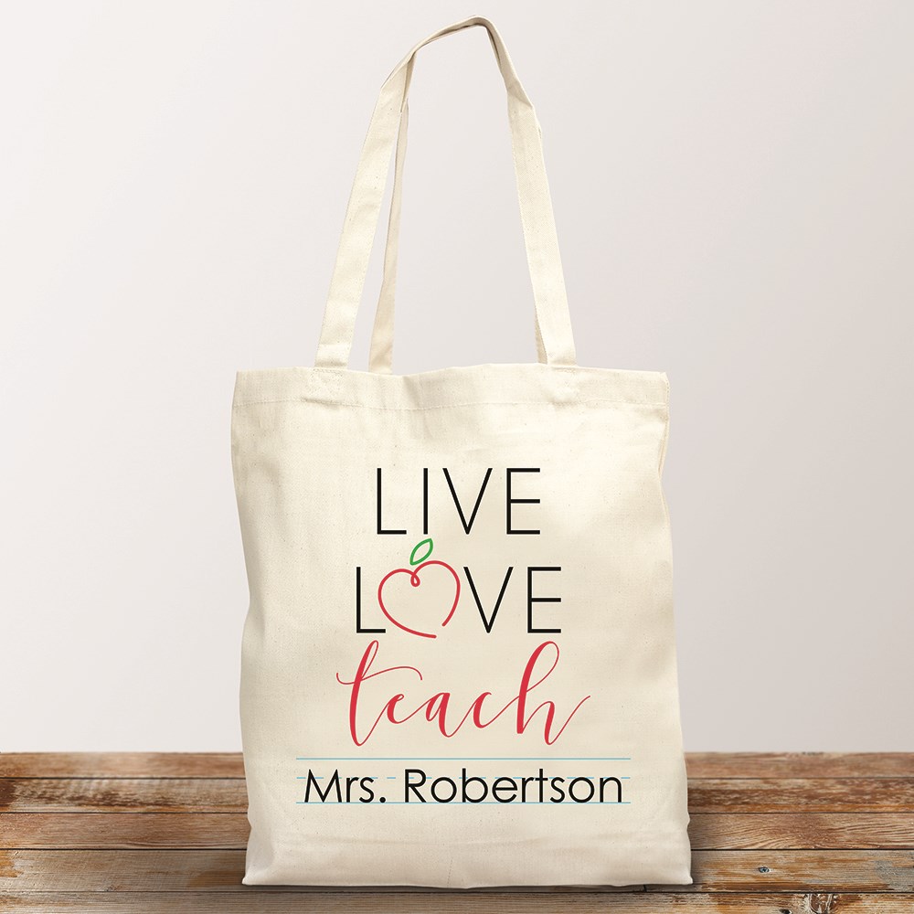 Our Personalized Live Love Teach Tote Bag will help teachers carry everything they need for lesson planning and grading.