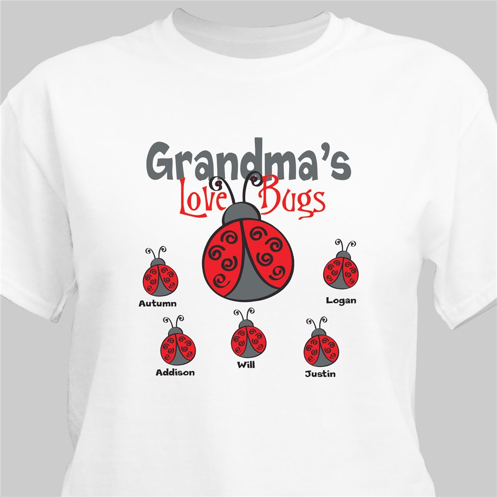 Fill your Grandma’s heart with the love of her grandchildren by displaying each one of their names on these wonderful Personalized Grandma TShirts. Grandma is sure to love this Love Bugs T-Shirt featuring each one of her precious little grandkids. This Personalized T-Shirt for Grandma also makes an excellent gift for Mom’s & Aunts as well.