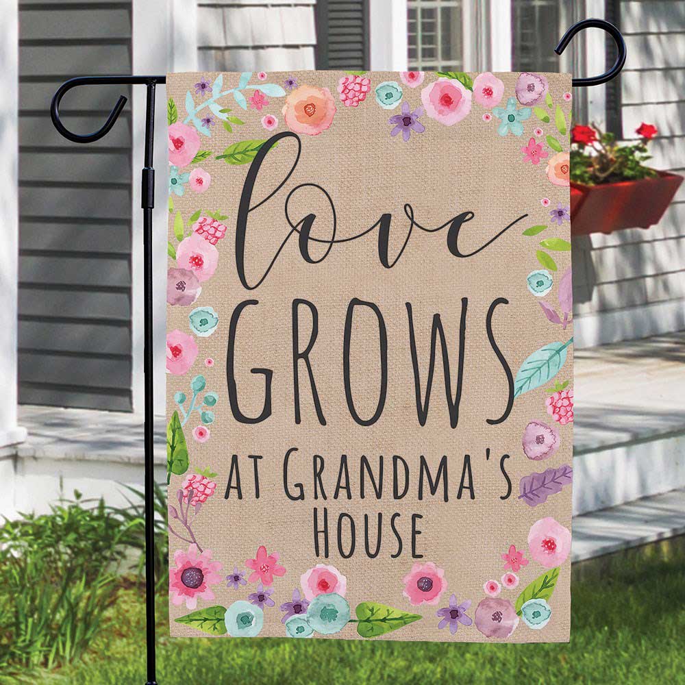 Our Personalized Love Grows Here Garden Flag is perfect to display outside of any loving home.