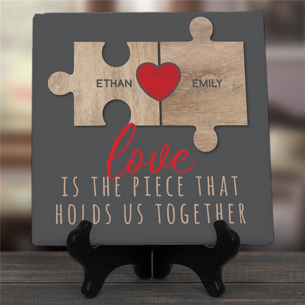 Additional Details Show your love how you fit together perfectly with this Love Is The Piece That Holds Us Together Personalized Table Top Canvas 8" X 8"