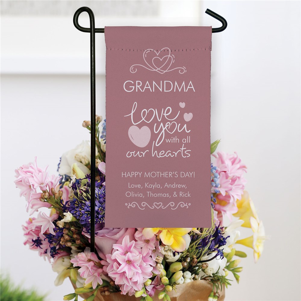 Let Grandma display her loves with this adorable Personalized Love You With All Our Hearts Mini Garden Flag.
