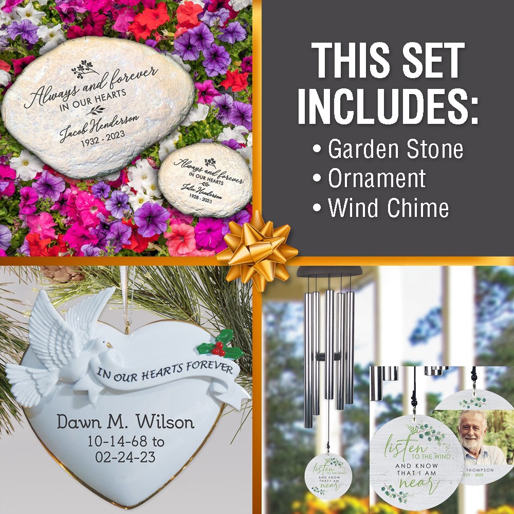 This 3 piece set includes a garden stone and wind chime for outdoor decor as well has a special ornament to be displayed in your home year round or hung on your Christmas tree every winter.