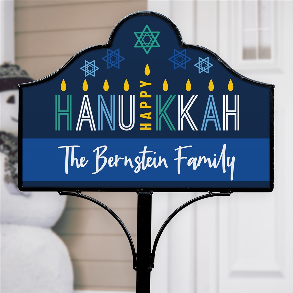 This decorative outdoor sign creatively features the word Hanukkah as a menorah and can be personalized with any custom message line.