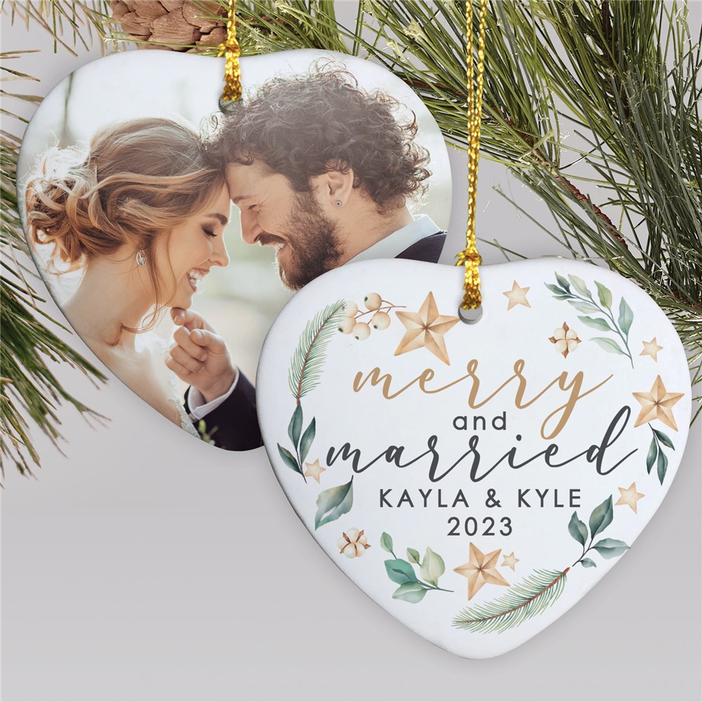 Commemorate this first Christmas as a married couple with our Personalized Merry & Married Photo Double Sided Heart Ornament!