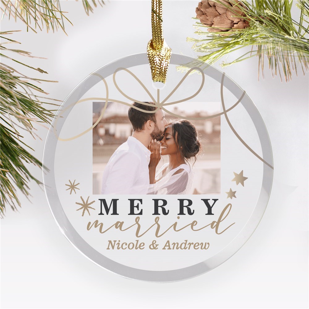 Couples who are announcing their engagement this Christmas or celebrating their first Christmas married will love having our Personalized Merry Married Photo Round Glass Ornament as a keepsake!