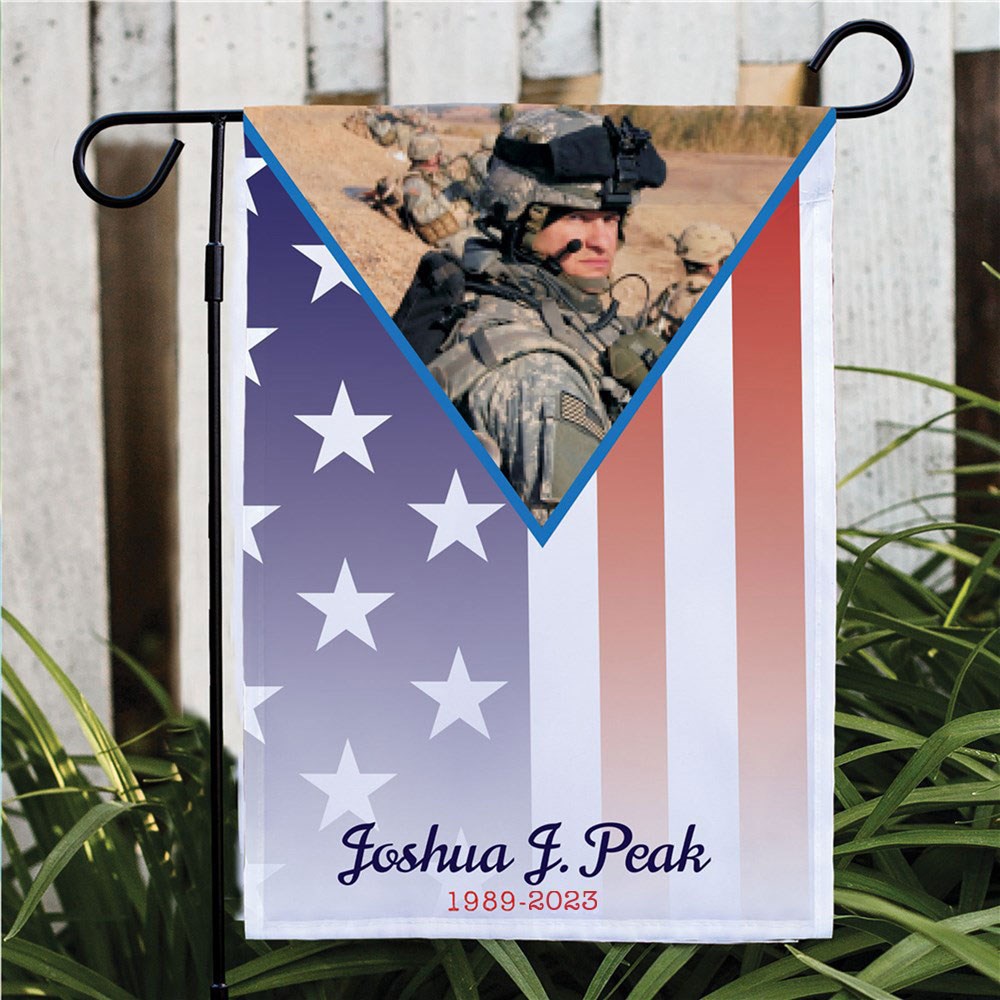 Those who lose their lives serving our country deserve to be honored. This memorial garden flag will honor your fallen soldier and keep their memory and service close to your hearts and in your spirit. This design may be printed on our one sided or double sided, durable, all-weather 100% poly garden flag that measures 12 1/2"w x 18"h. You may wish to display this flag on our optional garden flag pole, door hanger or window hanger, sold separately. Free personalization of any name, dates and a photo is included. For production purpose, please enter a description that best describes the photo you are uploading.