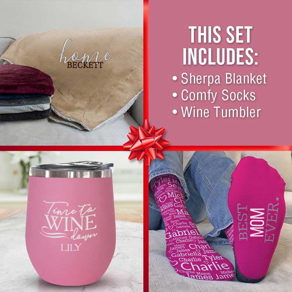 Gift Set For Mom with Blanket, Wine Tumbler, and Socks