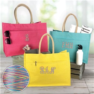 Embroidered Initials Jute Tote Bag with Rainbow Thread