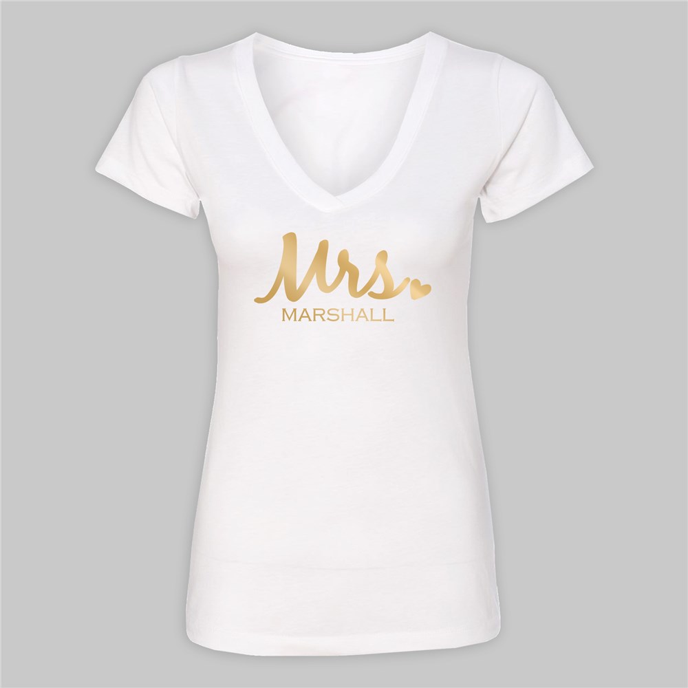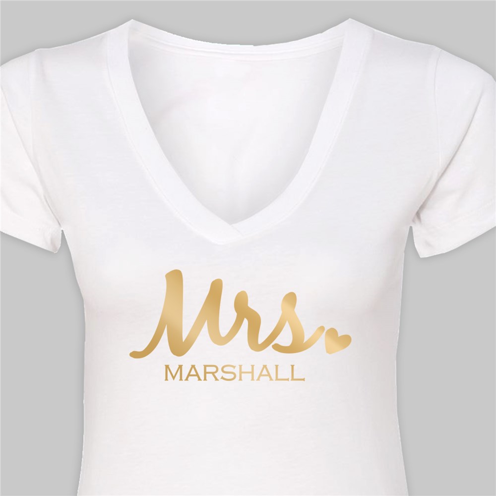 Stylishly celebrate your new last name on this flattering ladies t-shirt. We'll custom personalize any name below the exclusive Mrs. design. Personalized Mrs. T shirts make great newlywed gifts for the happy bride to be!