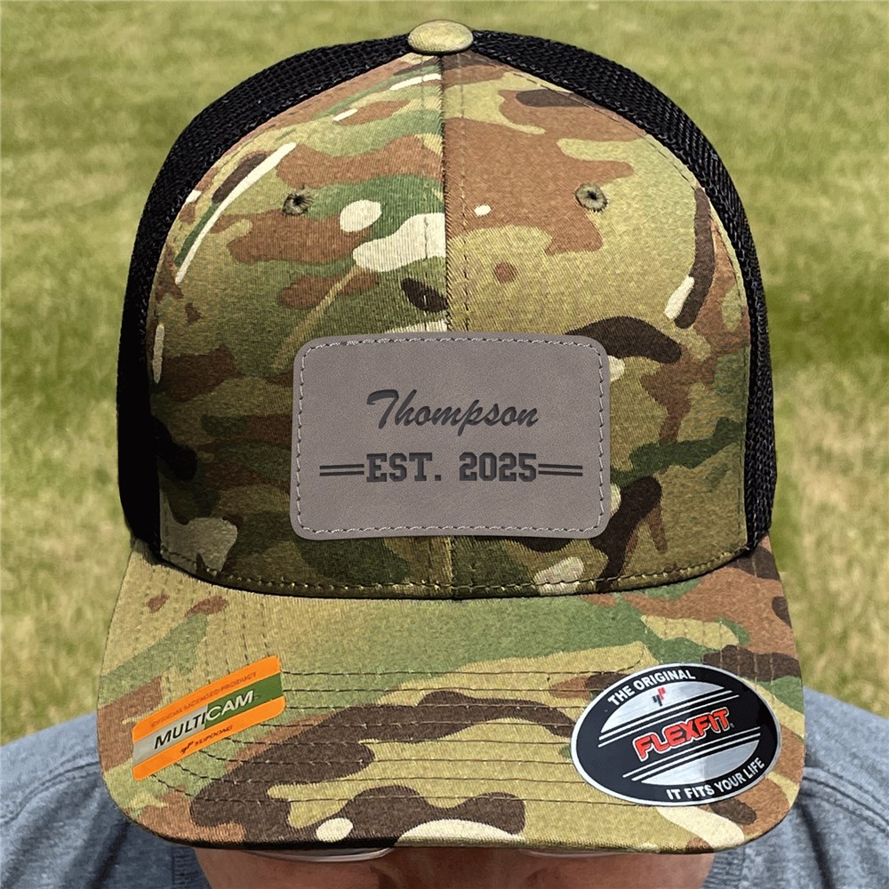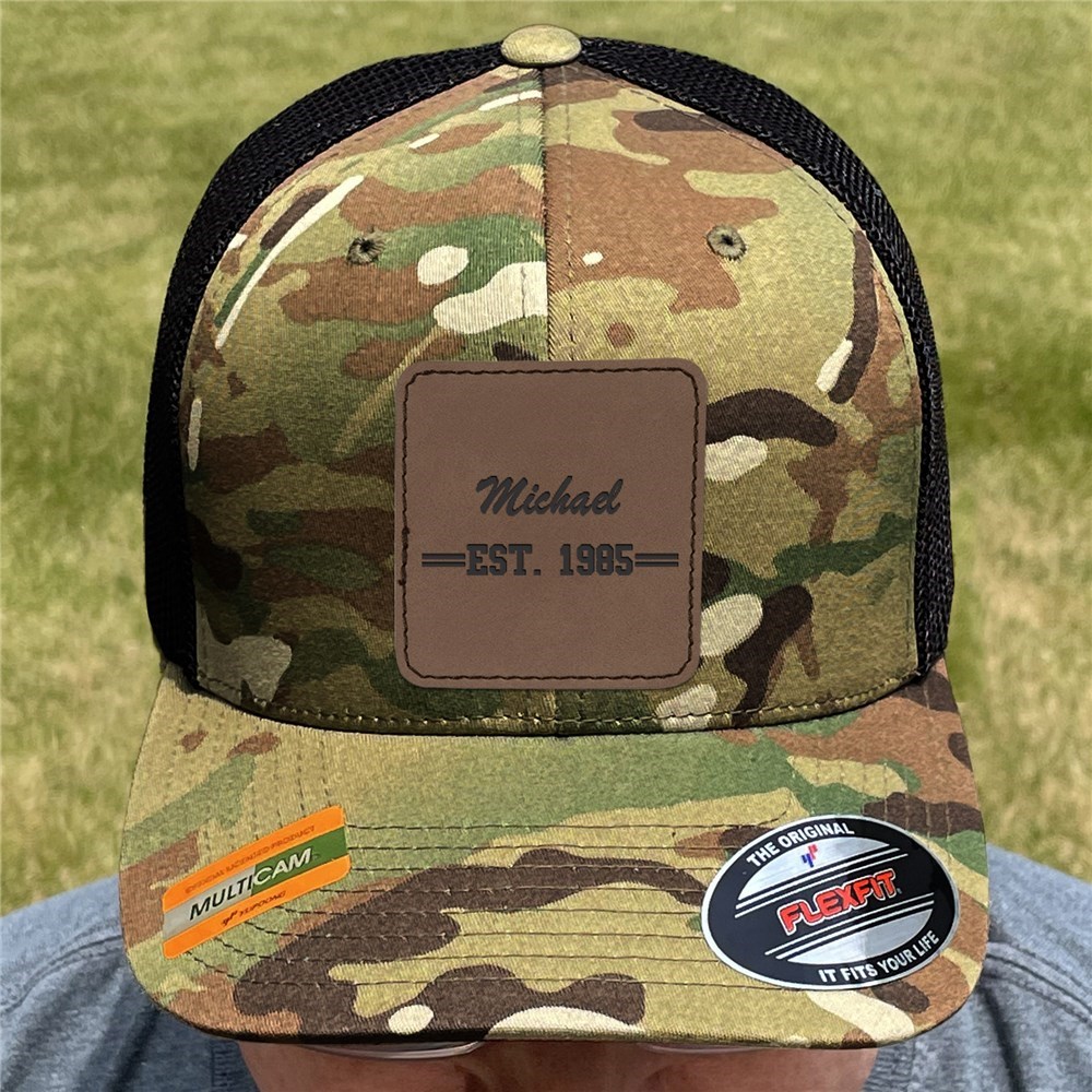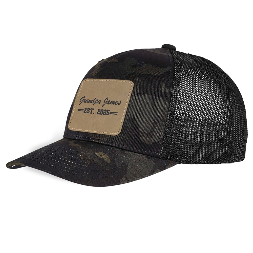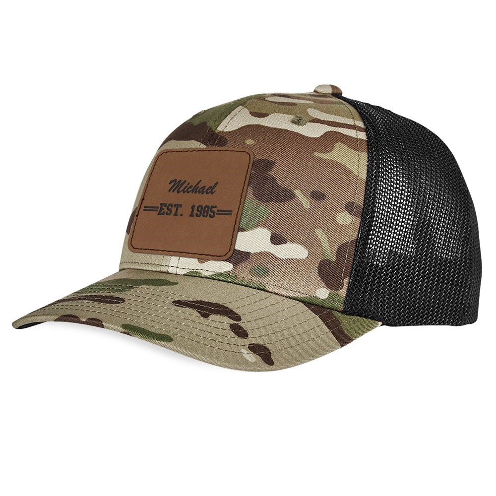 Upgrade Dad's hat collection with our Personalized Name with Established Date Camo Trucker Hat with Patch!