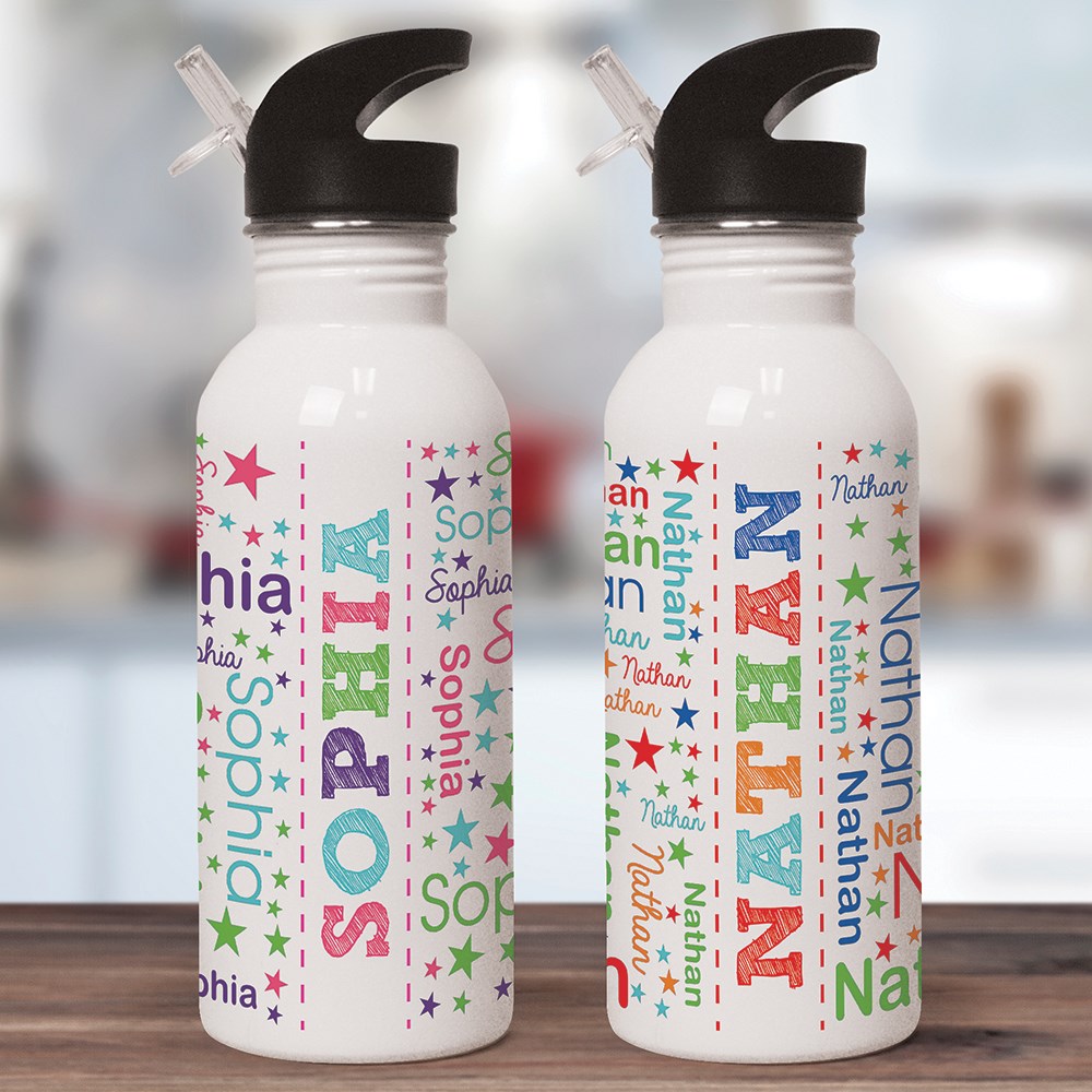 Complete your child's lunch with a drink using our Personalized Name Word Art Water Bottle.