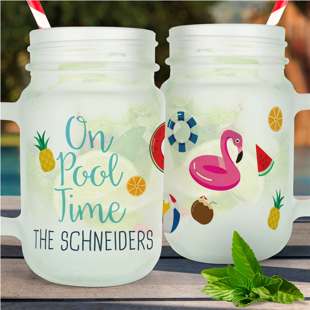 Sip in style this summer with our Personalized On Pool Time Frosted Mason Jar.Perfect for lounging poolside or hosting sunny backyard get-togethers, this vibrant mason jar features playful tropical graphics. Customize it with your family name or a fun phrase to make it uniquely yours!