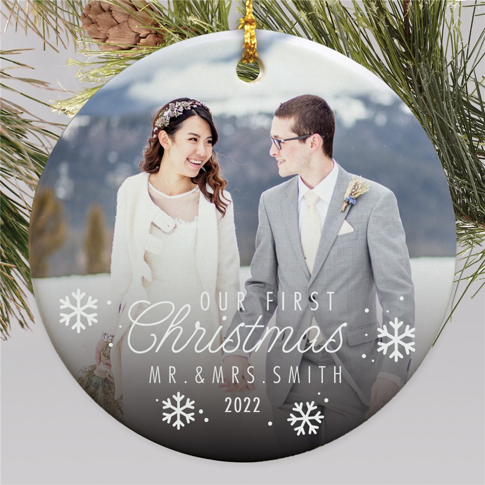 Never forget your first Christmas as a married couple with our Personalized Our First Christmas Snowflake Photo Ornament.