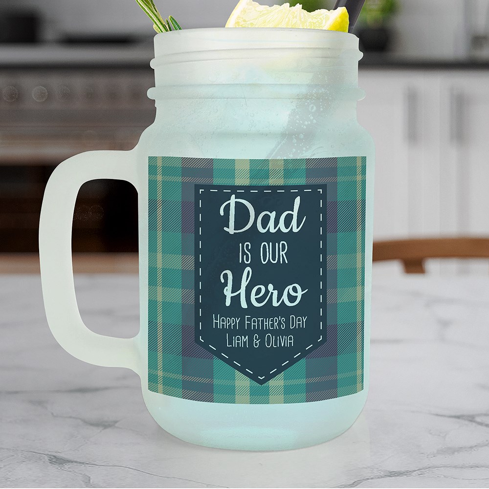 Celebrate the every day hero in your life with this bold and heartfelt Personalized Our Hero Frosted Mason Jar.Featuring a classic plaid design, this mason jar combines rugged style with a deeply personal touch. Add any title and two custom message lines at the bottom - perfect for names, dates, or a short note from the heart.