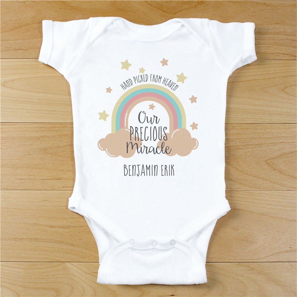 Your new miracle family member will look precious in this Personalized Our Precious Miracle Bodysuit. We will custom personalize this sweet Personalized Baby Onesie with any name. After every storm comes a rainbow, show off that adorable rainbow!