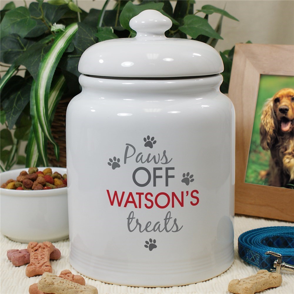 This Personalized Paws Off Treat Jar will let everyone know to keep their paws off your dog's treats! Personalize this jar with your choice of color and any name. A great way to store your pet's treats!