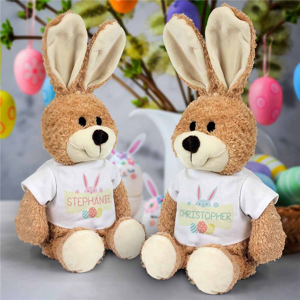 We will personalize this stuffed bunny's shirt with any name in your choice of design color.