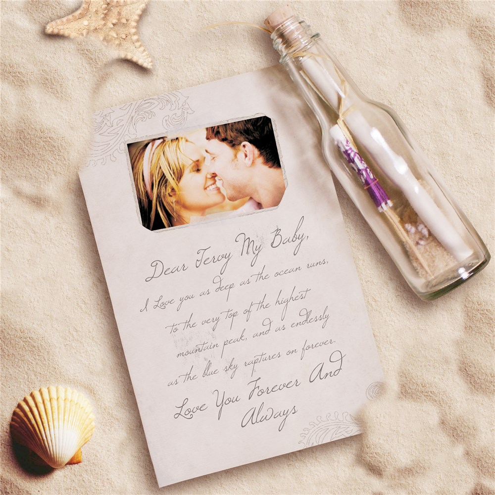 The story of a message in a bottle is always thrilling and romantic, and you can give your significant other their very own special selection for Valentine's Day this year. Our Personalized Message in a Bottle will be a unique gift that your sweetheart is not expecting, making this Valentine's Day more special than ever. This exclusive design of these Valentine Keepsake Gifts makes a creative way to carry out your romantic feelings. The 6 ½” glass bottle comes filled with sand, seashells, a beach umbrella and a beautiful poem printed on stylish parchment paper, then rolled and tied with a ribbon and securely corked on top. Free personalization of any photo along with your beginning sentiment and ending sentiment is included. For production purposes, please enter a description that best describes the photo you are uploading. A great gift for girlfriends or wives!