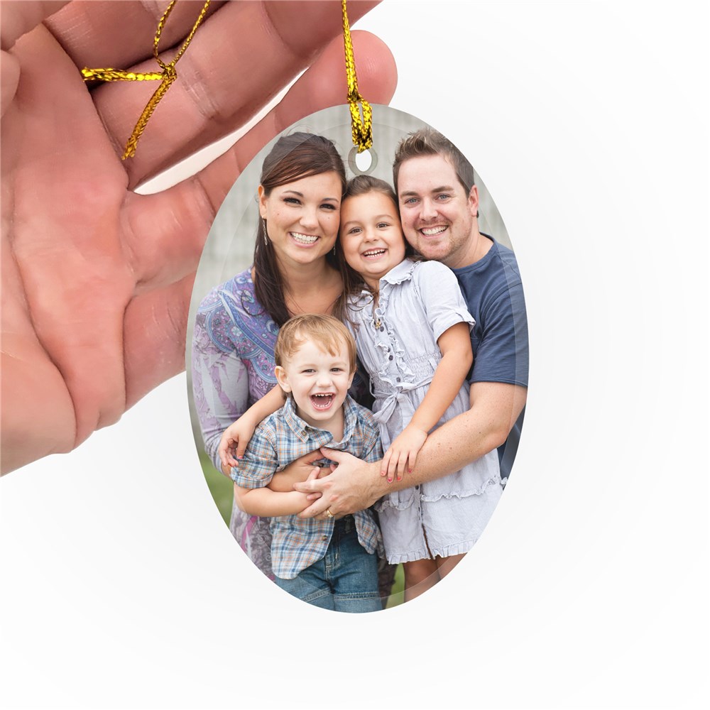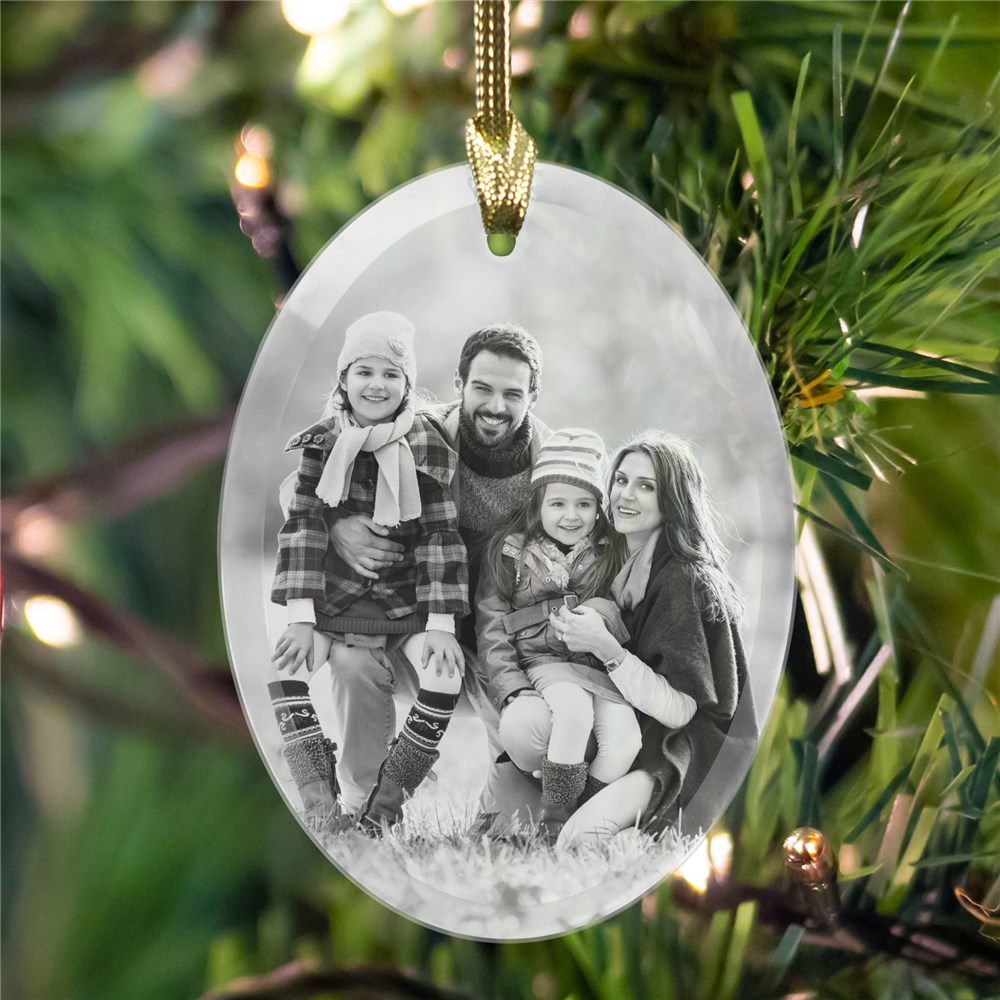 Your favorite family photo can be displayed on our Personalized Photo Oval Glass Ornament to hang on your tree this Christmas.