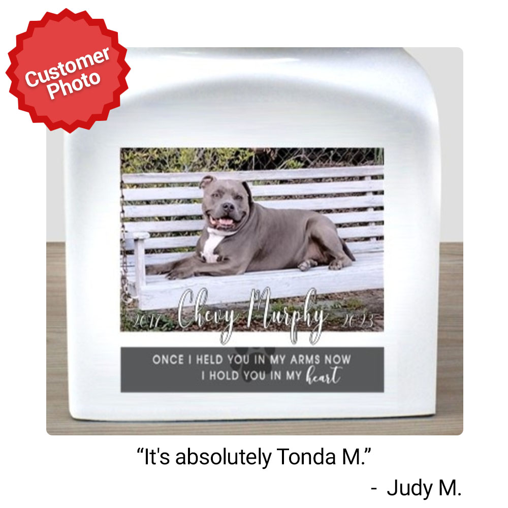 Recollect your beloved pet's spirit with this beautiful Personalized Photo Pet Urn.