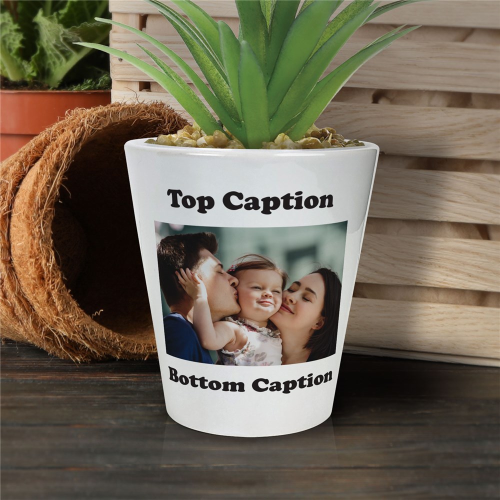Add a personal touch to your home or gift someone special with this Personalized Photo Small Ceramic Flower PotWe will personalize this flower pot with any photo with any two message lines, one above the photo and one below, with your choice of text color.