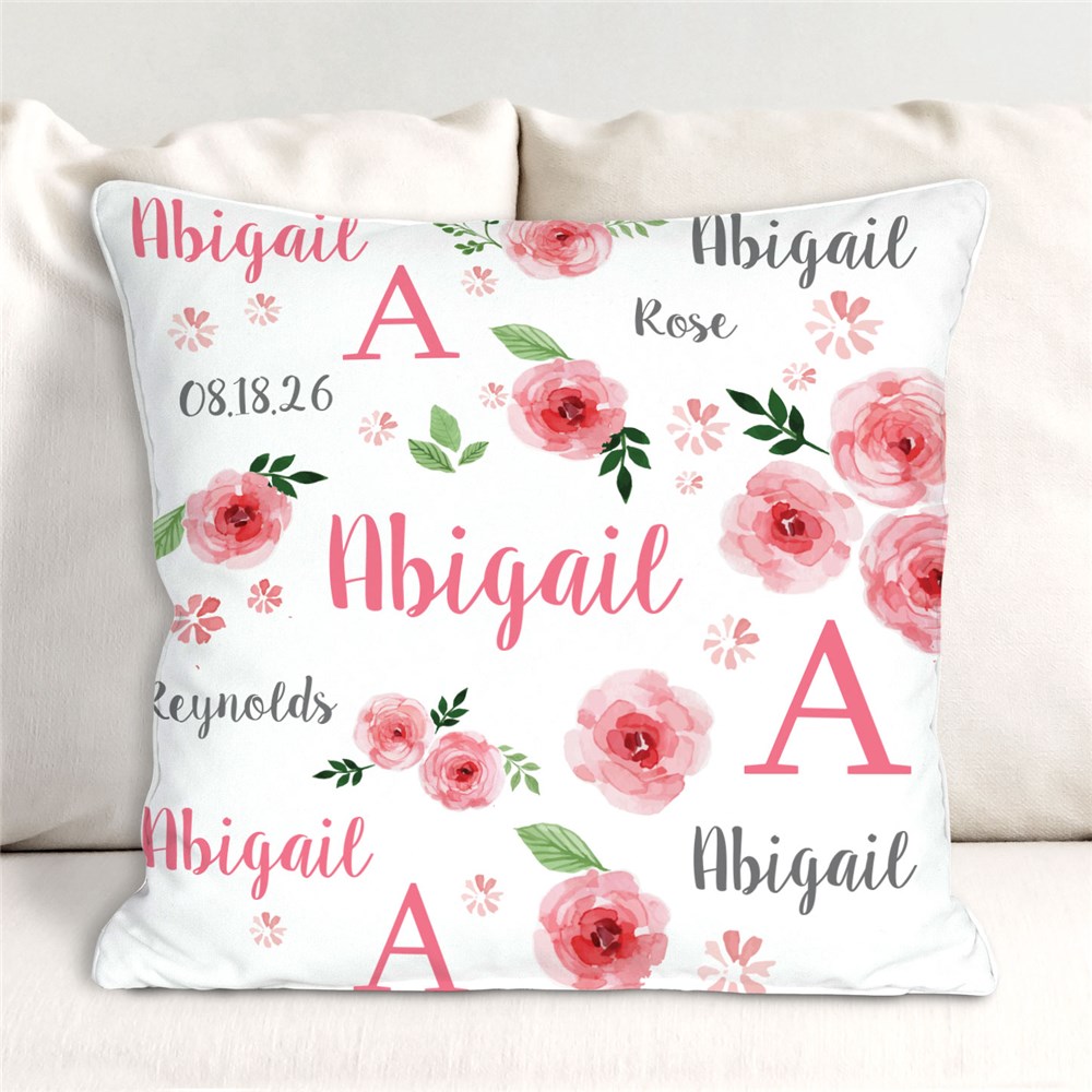 Celebrate the arrival of your baby girl by decorating her room with our Personalized Pink Floral Throw Pillow.