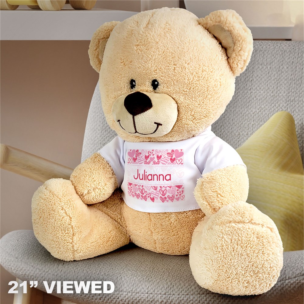 Give your love something to squeeze when you're not there with this adorable personalized pink hearts teddy bear. This customized teddy bear is wonderfully soft, and he has an irresistible look on his face. This precious bear is available in three great sizes ranging from 11" to 21, and his shirt comes personalized with any name (up to 12 letters). It's the gift that provides endless hugs!