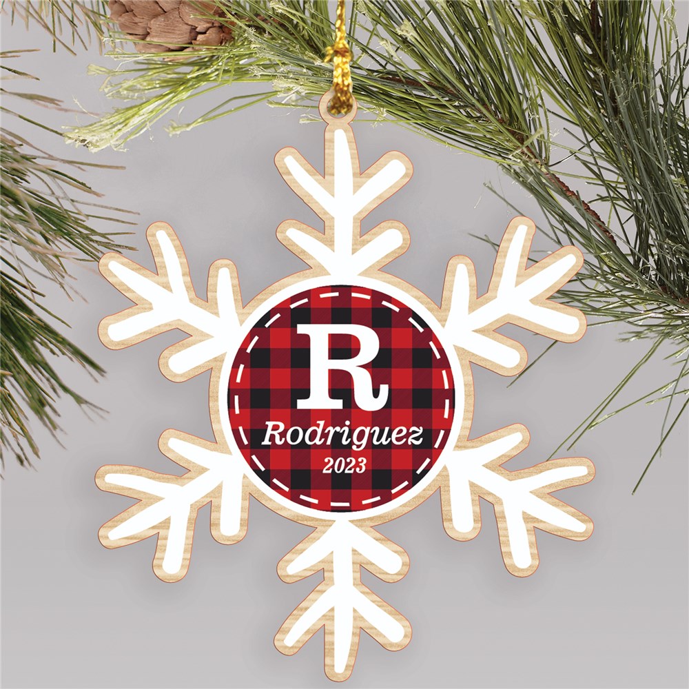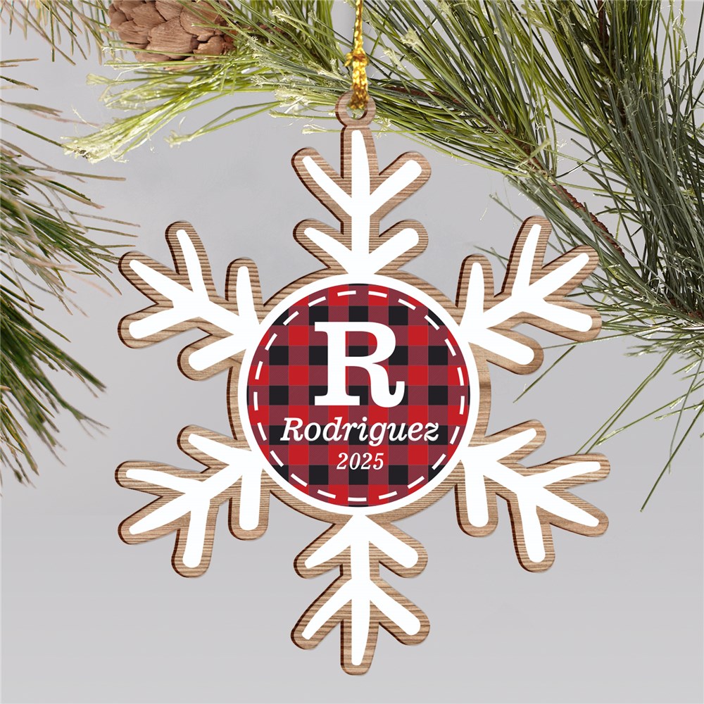 Custom Plaid Snowflake Wood Ornament With Initial
