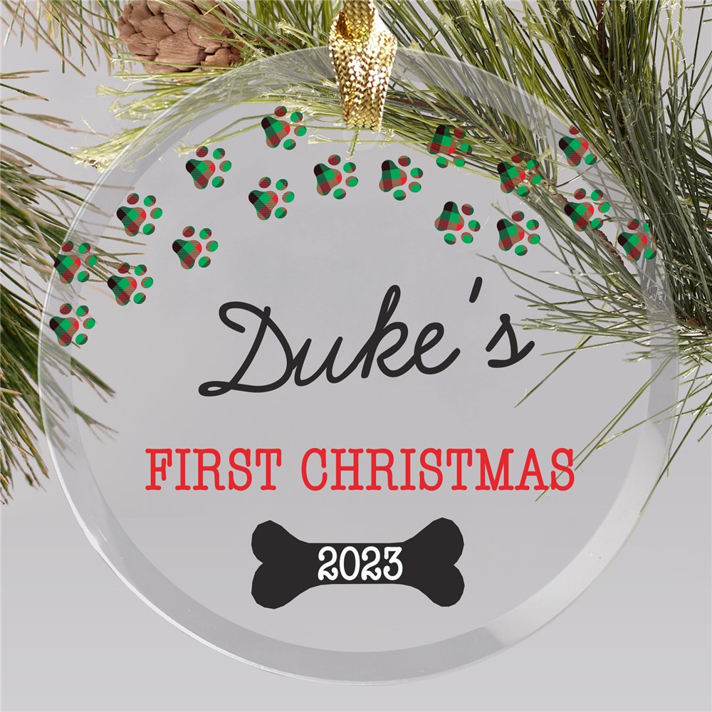 Our Personalized Plaid Paws 1st Christmas Round Glass Ornament is an ideal holiday keepsake for any family who adopted a new dog this year!