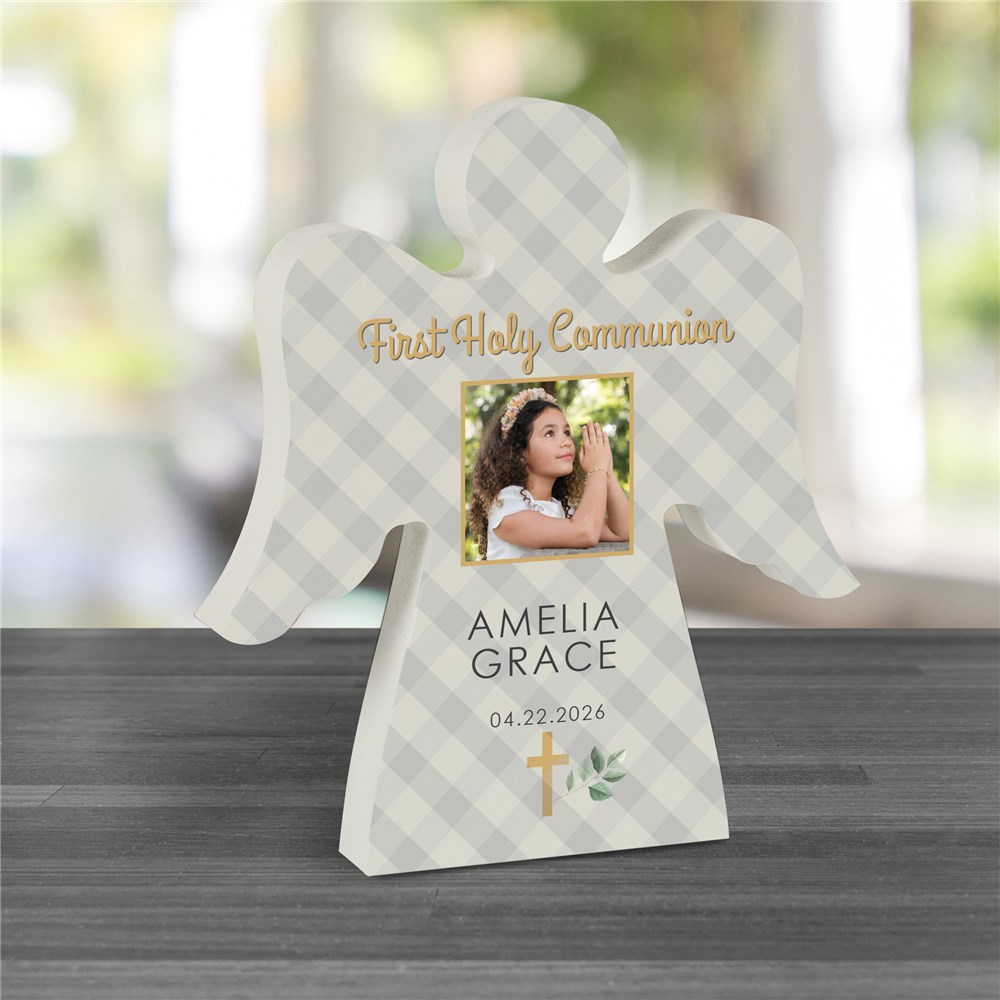 Congratulate any child on their first communion or any parents on their baby's baptism with our Personalized Plaid Religious Angel Shaped Sign.