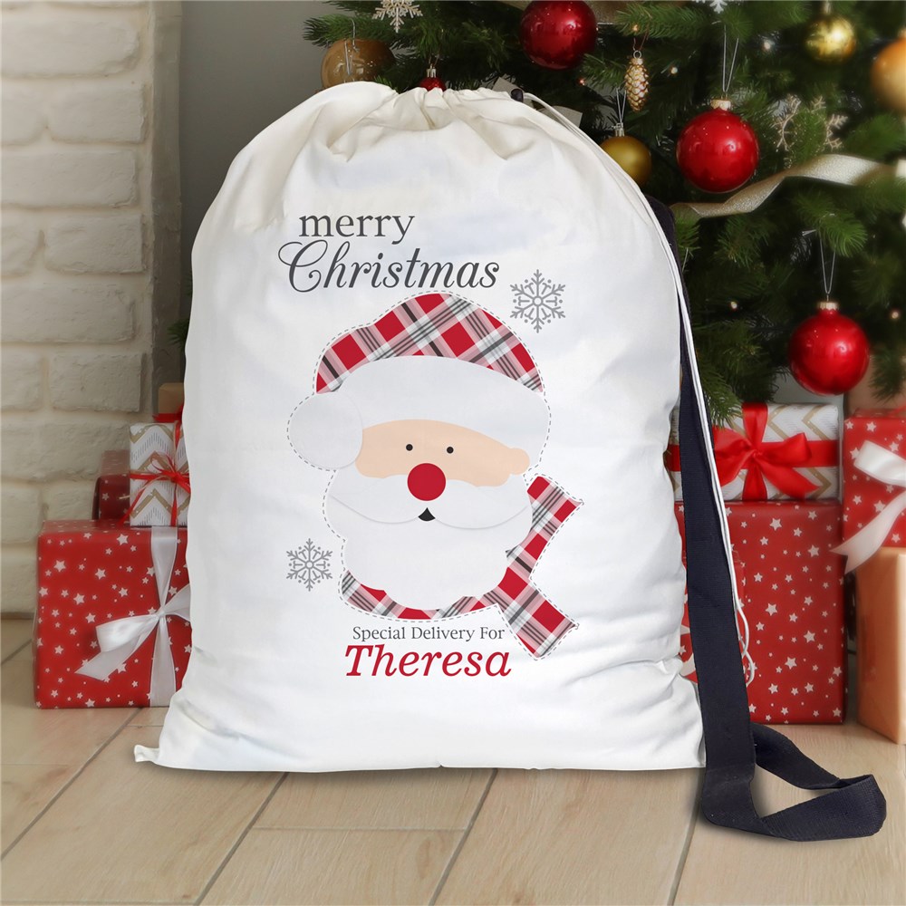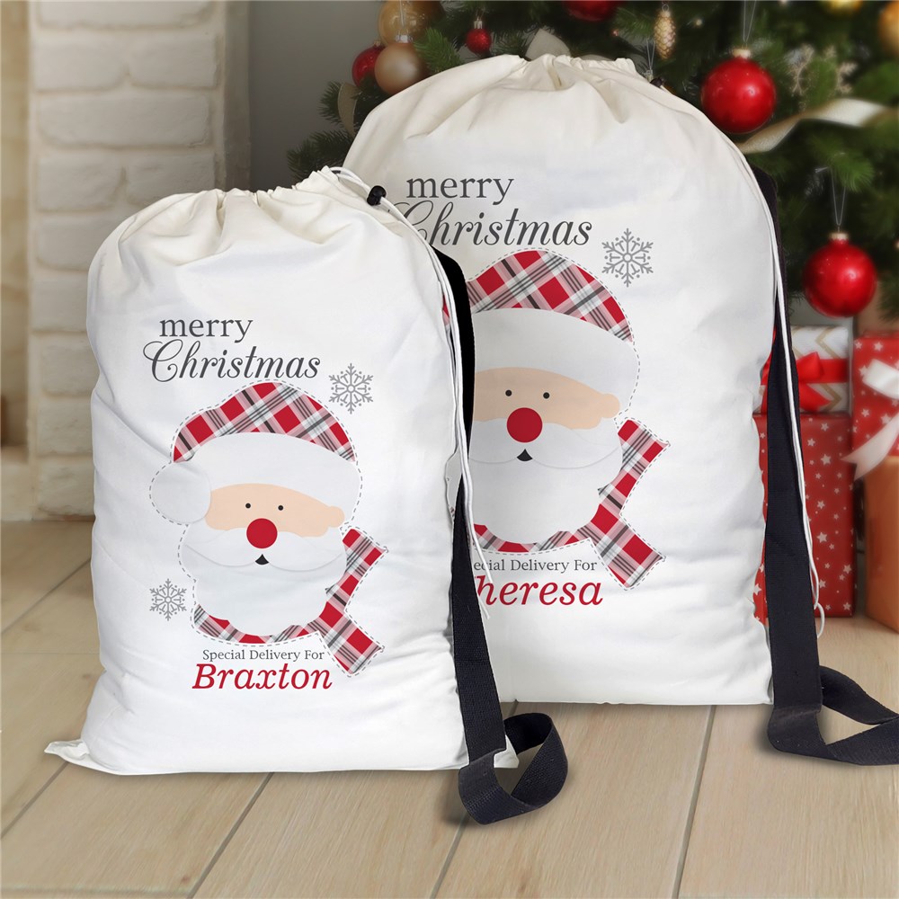 Deliver a timeless touch of holiday cheer with our Personalized Plaid Santa Christmas Gift Sack.