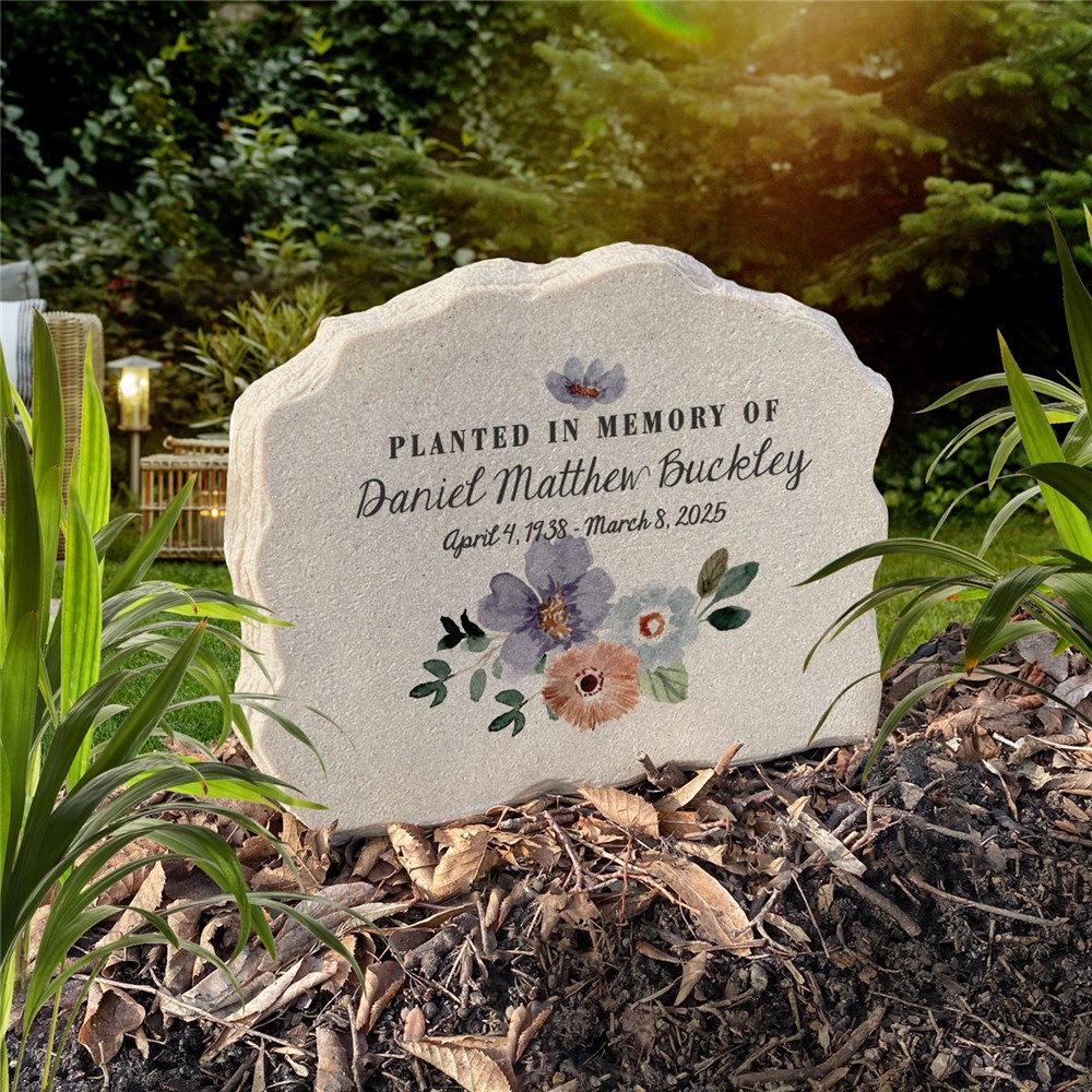 Celebrate the life of a loved one with this Personalized Planted In Memory Standing Garden Stone. Designed with delicate floral artwork, this stone is perfect for placing beside a memorial tree, flower bed, or special plant. Personalize it with two custom message lines — such as a name, birth date, and rest date — to create a peaceful tribute that blooms with every season.