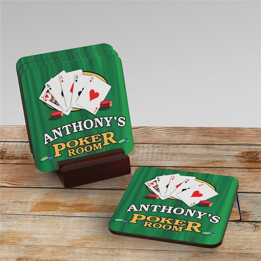 Set an authentic scene at your next card night with our personalized poker coaster set, which comes with four premium hardwood square coasters with cork bottoms in a mahogany holder. Each coaster will be personalized with any name, up to 16 characters, proving that the house always wins.