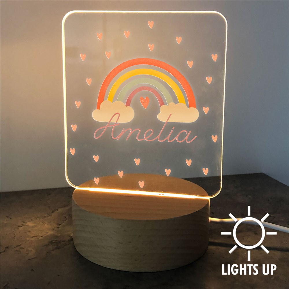 Decorate your child's room with this colorful Personalized Rainbow & Hearts Square Custom LED Sign.