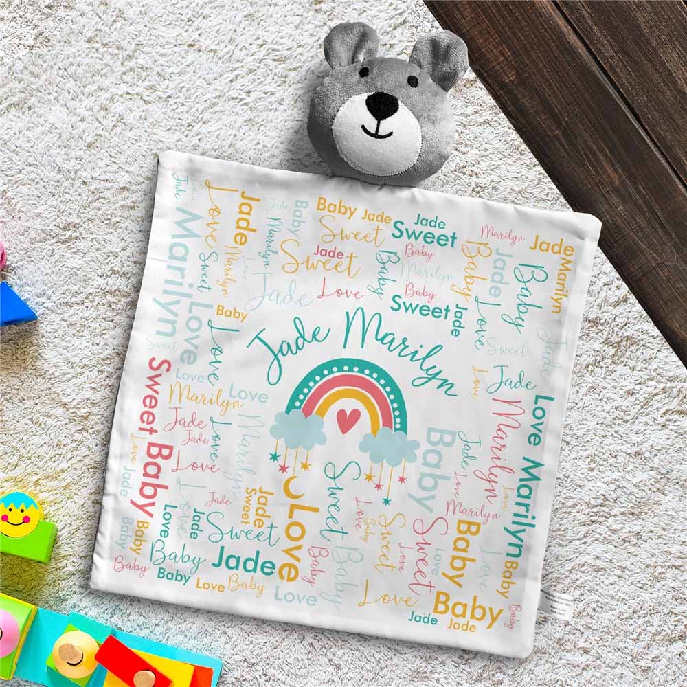 Give your baby our Personalized Rainbow Word Art Bear Lovie to cuddle and snuggle with!