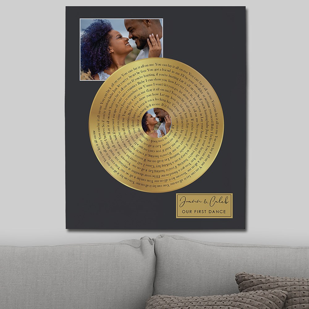 This Personalized Record Spiral Song Lyrics Canvas is a beautiful way to display your wedding song and photos in your home.Using our spiral word art tool, add in the lyrics to the song from your wedding! Add your favorite two wedding photos, (photo 1 top left and photo 2 in the middle) and any two custom message lines.