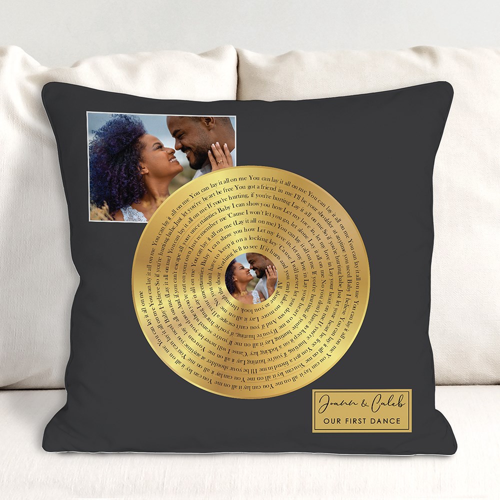 Display your wedding song with this Personalized Record Spiral Song Lyrics Throw Pillow.Using our spiral word art tool, add in any lyrics, then add any two photos, (photo 1 top left and photo 2 in the middle) and any two custom message lines.