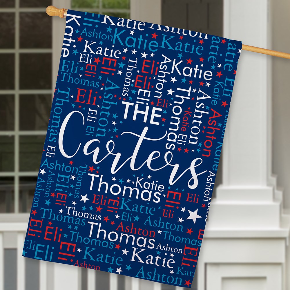 Celebrate the 4th of July with our Personalized Red White and Blue Word Art House Flag.This patriotic flag can be personalized using our word art tool with any family name, words and symbols you choose.