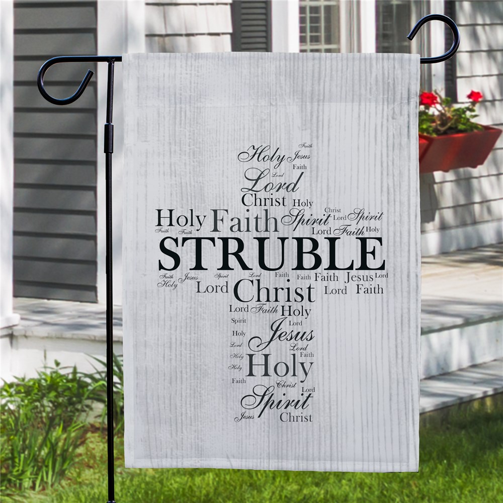 Display your wonderful faith right at the front entrance of your home when you display this religious word-art garden flag. We'll create this special family garden flag using our word art tool. All of your religious words will be represented in a unique, creative way.When you see the Word-Art compilation your like, select the Add To Cart button. This will automatically save your design into your cart. If you would like to see another rendition of your Word-Art compilation simply select the View Your Personalization button again. This will automatically create another version for review. Once you are satisfied with the design, select the Add To Cart button.