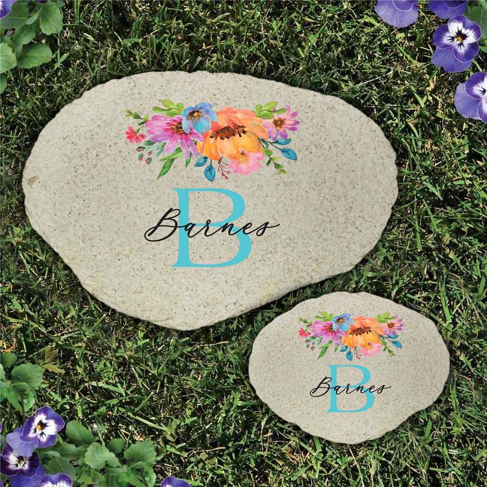 Featuring a pretty and colorful floral design, this stone can be personalized with any initial and family name