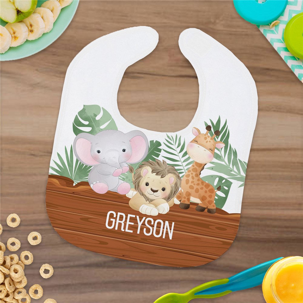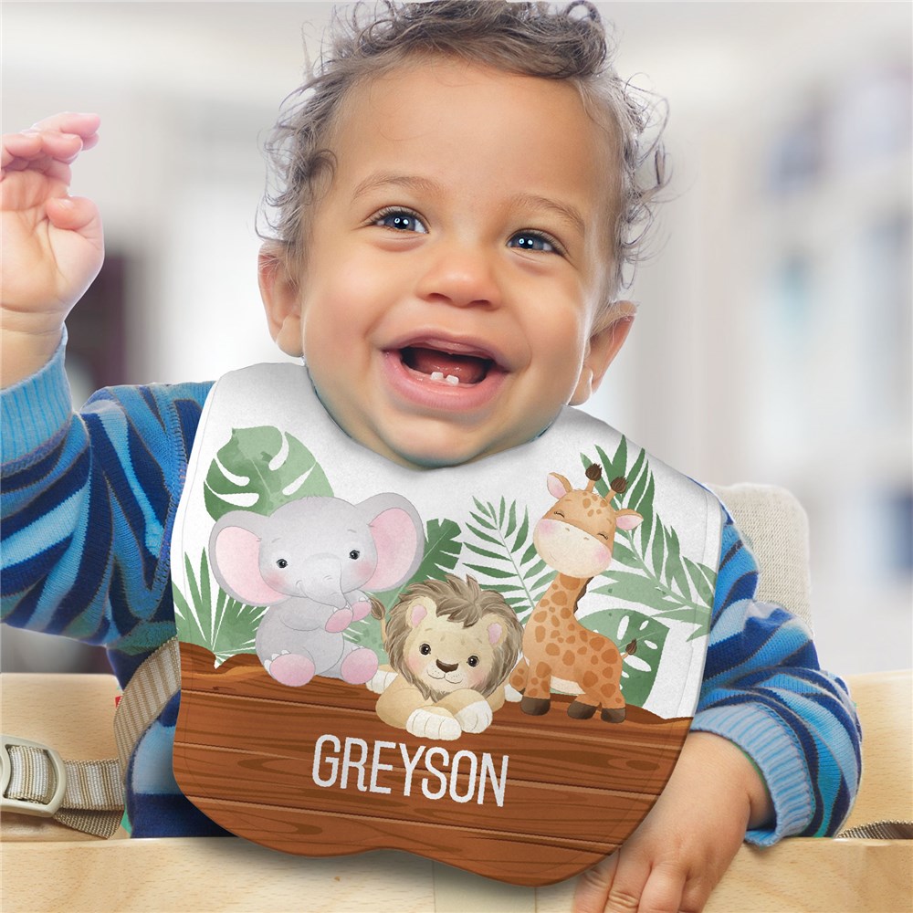 Personalize this safari themed bib with any name for a cute and practical baby gift.