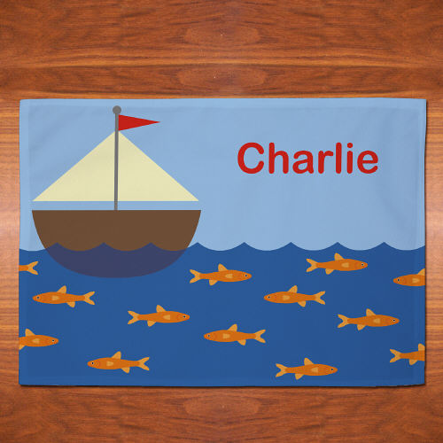 Sailboat Placemat - Personalized Sail Away PlacematSail away in the deep blue sea with our Personalized Sailboat Placemat. This great design features a Sailboat surrounded by a school of goldfish. To make it a truly unique gift idea, we will personalize this mat for free! Your Sailboat Place Mat measures 12.5” x 18” and features smooth, white 100% poly top and black 100% cotton back. Easily washes with cold water and mild soap. Do not machine wash. Free personalization of any name is included.