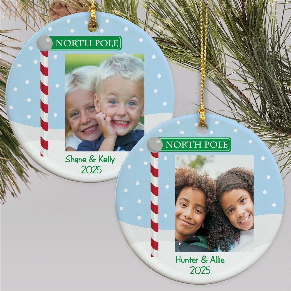 Surprise Grandma, Grandpa or even Mom and Dad with a photo from Santa's visit, personalized on this great Ceramic Christmas tree ornament. Photo ornaments come with free personalization of any two line custom message included at the bottom of the photo. Order your picture Christmas ornaments today!