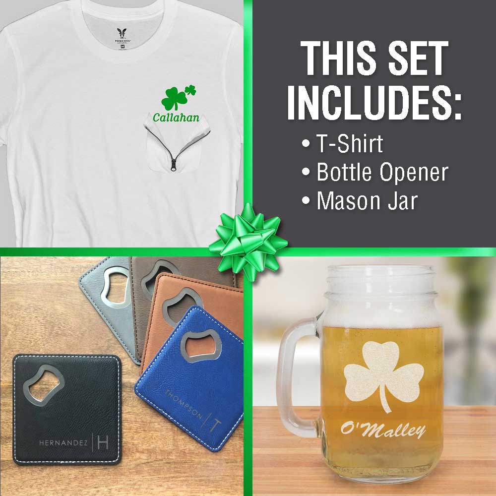 This set includes a zipper pocket t-shirt with a shamrock design, a mason jar for your favorite beer and a dual purpose bottle opener coaster.