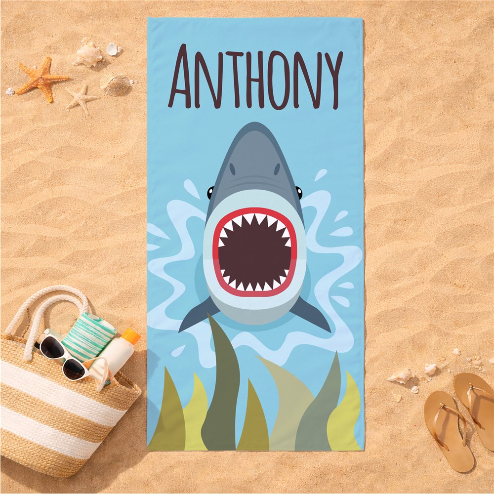 Personalize this beach towel with this awesome shark design with any name, to make a unique towel just for him.
