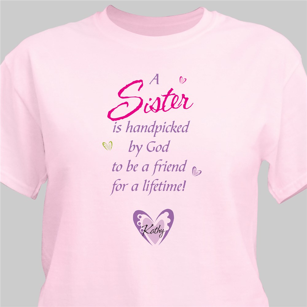 Give your sister a personalized gift that will show her how much your relationship means to her. She'll love wearing this comfy t-shirt, and she'll be especially touched by the message on it! If she loves this gift, you can also get her our Personalized Sisters Mug.