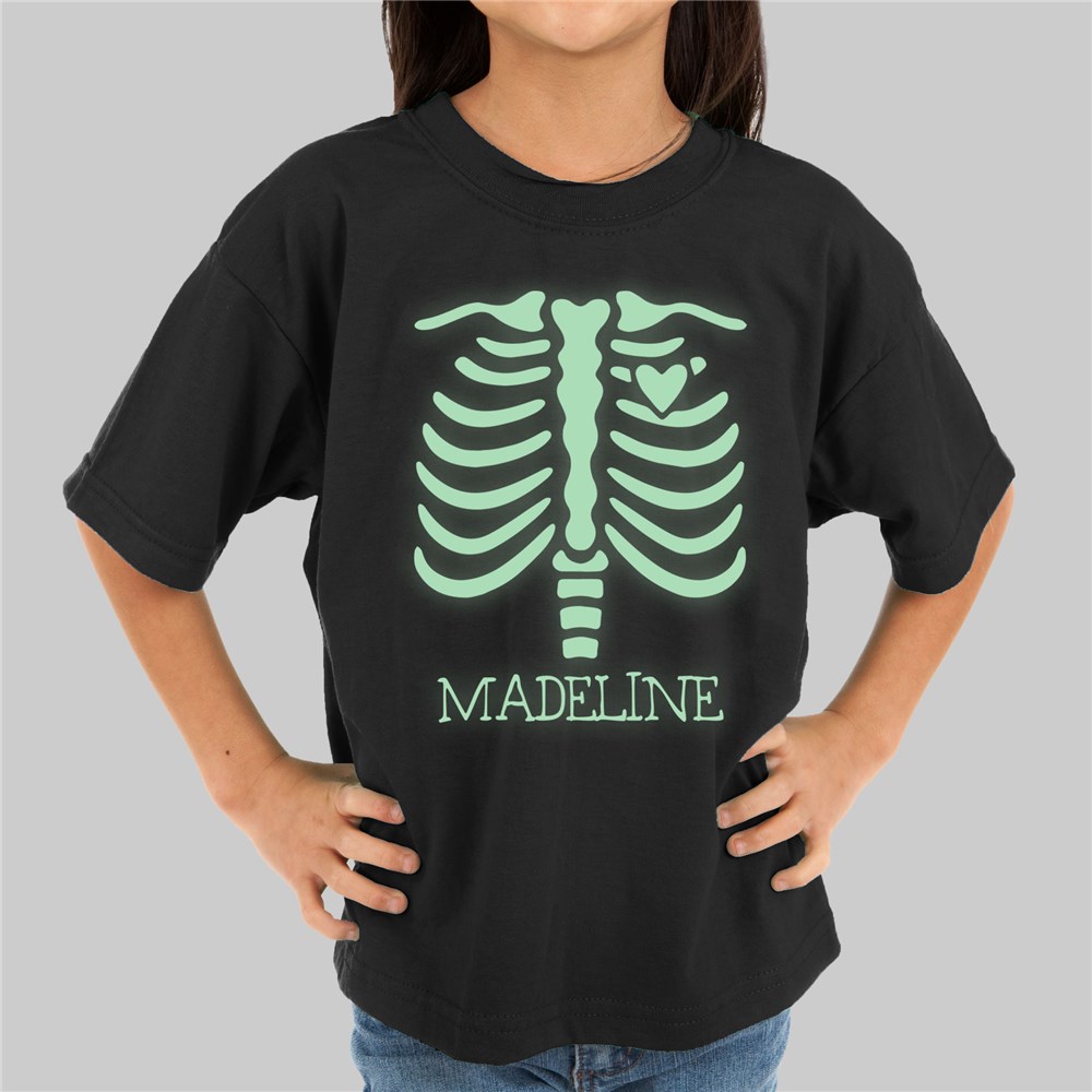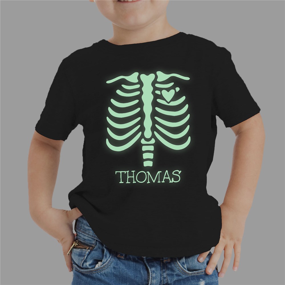 Our Personalized Skeleton Body Glow in the Dark T-Shirt will be perfect for kids to wear all October long, whether it's to school or any Halloween related activities!