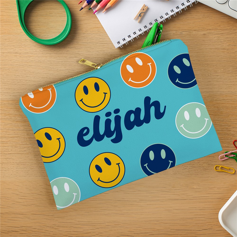 Bright, bold, and full of good vibes—this Personalized Smiley Face Zipper Pencil Pouch is perfect for adding a pop of fun to your school supplies! Featuring a playful mix of colorful smiley faces and your custom name in a bold script font, it’s both practical and totally unique. Whether it’s for school, art supplies, or everyday essentials, this pouch brings the happy wherever it goes.